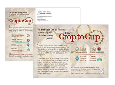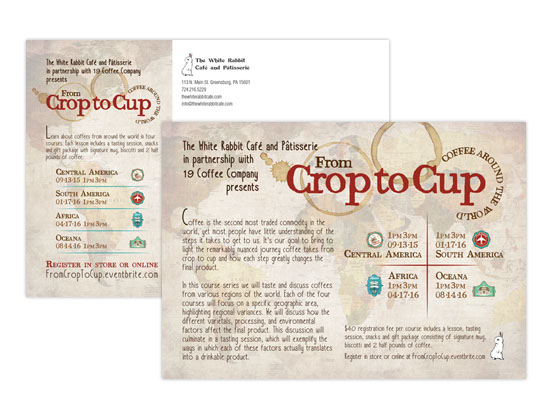 Postcard to promote quarterly coffee course featuring coffees from around the world.